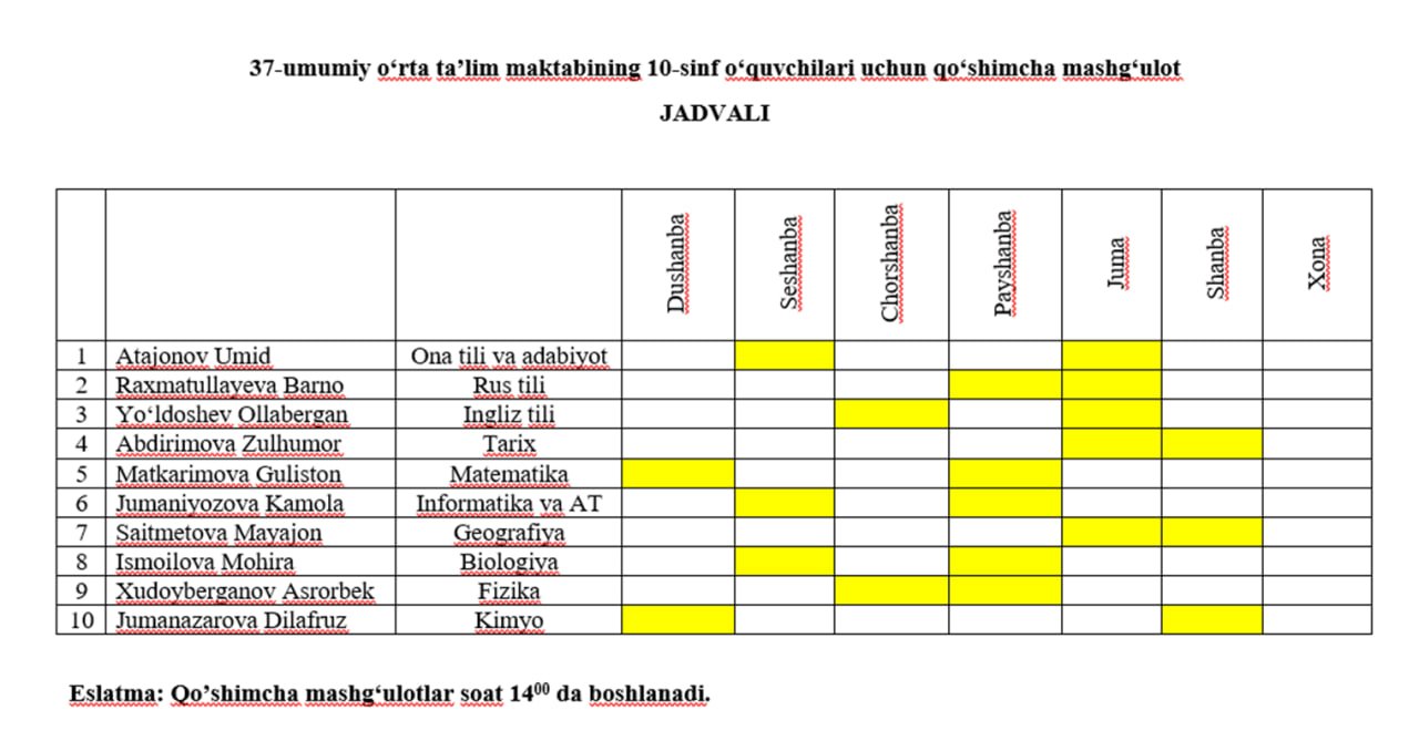 To'garaklar jadvali 3-11-2023, 12:53 37-umumiy o‘rta ta’lim maktabining 9-11 sinf o‘quvchilari uchun qo‘shimcha mashg‘ulot JADVALI